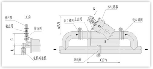 | 型號(hào) | 管徑 (mm) | 過濾流量 (m3/h) | 過濾面積 (cm3) | 排污閥DN (mm) | 一次清洗 水量(L) | 電機(jī)功率 (KW) | 重量 (Kg) | D (mm) | A (mm) | A (mm) | B (mm) | C (mm) | C (mm) | L (mm) | G (mm) |