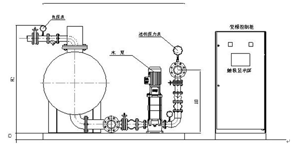 RWG系統(tǒng)智能型無負壓變頻供水設備是由穩(wěn)流調節(jié)器、負壓抑制器、水泵機組、智能變頻控制柜、遠傳壓力表、各種閥門管件等組成。其原理圖如下所示。
