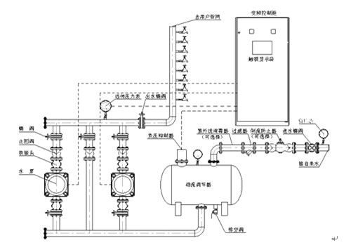 RWG系統(tǒng)智能型無負壓變頻供水設備是由穩(wěn)流調節(jié)器、負壓抑制器、水泵機組、智能變頻控制柜、遠傳壓力表、各種閥門管件等組成。其原理圖如下所示。